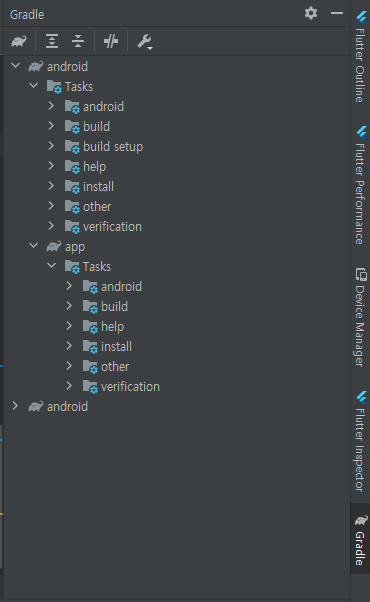 다만 이렇게 되는 경우 Gradle의 Task들이 안보일 수 있는데, 그렇다면 다시 맨처음으로 돌아가 셋팅부분을 다시 확인 후 disable 한뒤 안드로이드 스튜디오를 켜보면 (지금까지는..)되었다.
