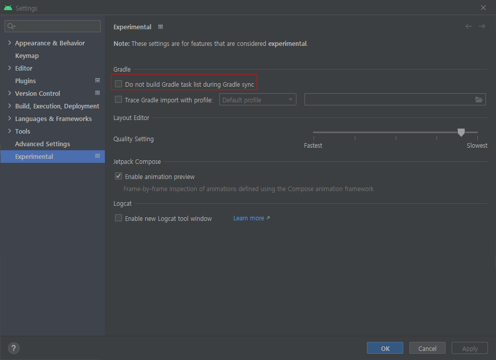 Gradle영역의 "Do not build Gradle task list during Gradle sync"를 해제 해준다.