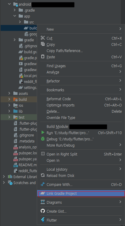 프로젝트 기준해서 app기준의 build.gralde를 우클릭하면 Link Gradle Project가 생기는데,