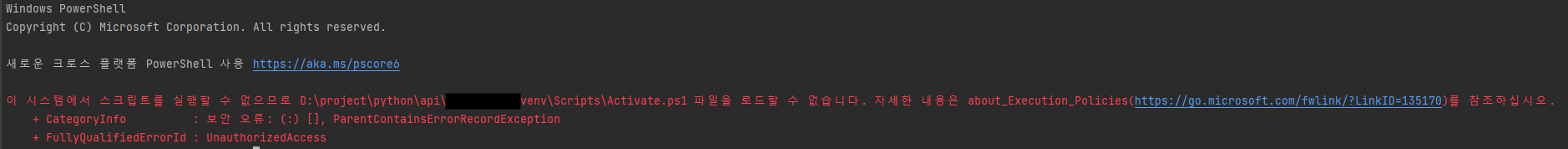 이 시스템에서 스크립트를 실행할 수 없으므로 D:\project\python\api\....\venv\Scripts\Activate.ps1 파일을 로드할 수 없습니다