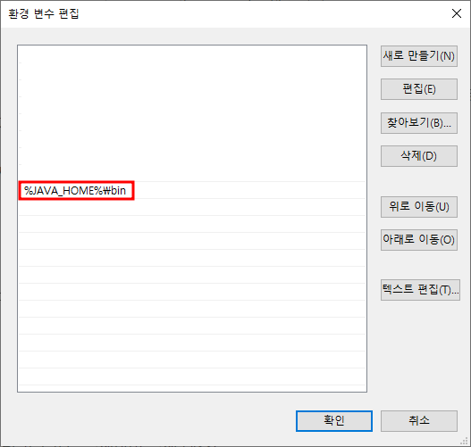 만약 만들지 않았다면 "{Java를 설치한경로}\bin"을 기입하여 완료한다.