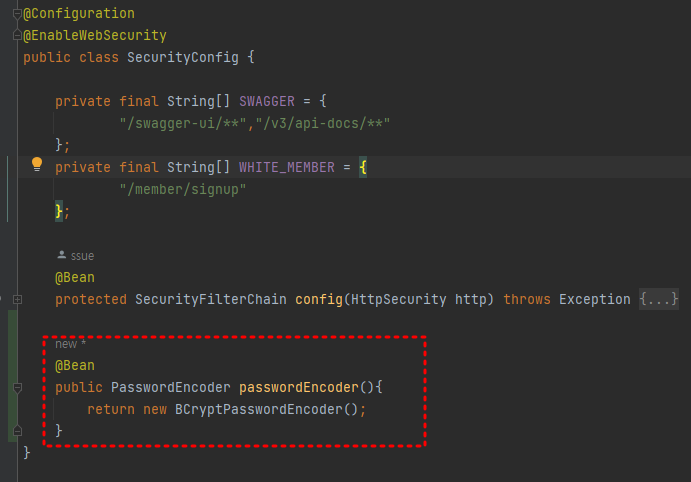 SecurityConfig에 PassworEncoder를 직접 Bean등록을 해줍니다.