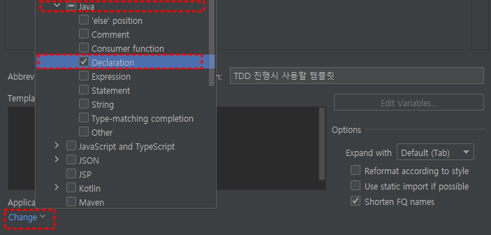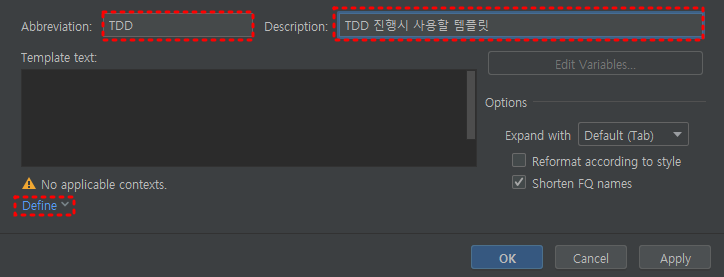 * Abbreviation : {인텔리제이에서 호출할 템플릿 명령어 명}