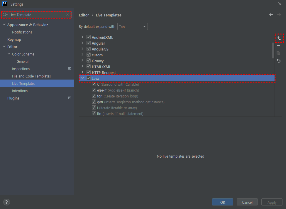 이후, 우측에 있는 "+" 버튼을 통해 라이브 템플릿 생성할 준비를 마칩니다.