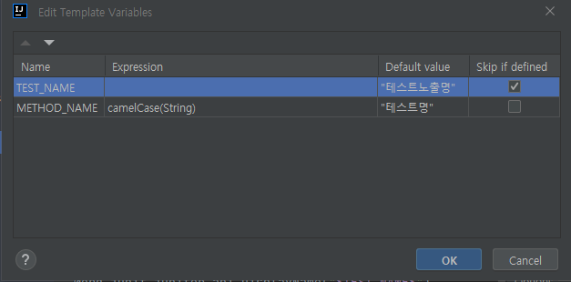 * "$METHOD_NAME$" : 테스트 진행시, 테스트 함수 명에 대해서 표현합니다.