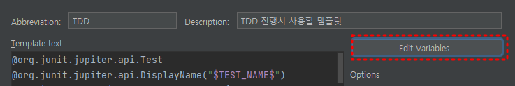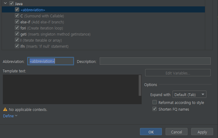 * Abbreviation : {인텔리제이에서 호출할 템플릿 명령어 명}