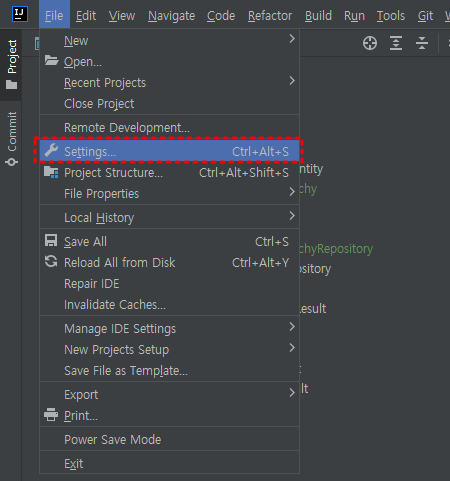 인텔리제이 설정으로 진입합니다. ("Ctrl + Alt + S "를 이용해 바로 진입 할 수 있습니다. )