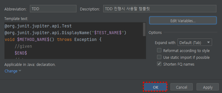 라이브 템플릿을 이용하여 누구보다 빠르게 TDD 기본 구조를 만드는 것을 보고 활용하기 위해 기록.