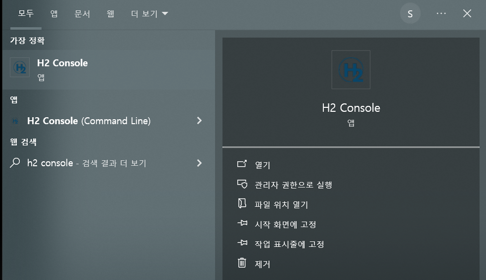 실행방법1.윈도우 검색창에 "H2 Console"을 검색한후, 열기를 통해 열게 될 수 있습니다.